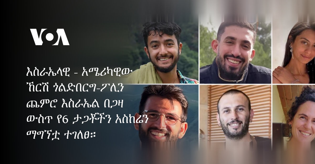 • እየሩሳሌም — እስራኤል የ6 ታጋቾችን አስክሬን ጋዛ ውስጥ  ማግኘቷን በዛሬው ዕለት አስታወቀች። ከእነዚህ መካከል በሀማስ ከተያዙ እና በእጅጉ ታዋቂ ከነበሩት መካከል አንዱ የነበረው ወጣቱ እስራኤላዊ-አሜሪካዊ ኸርሽ ጎልድበርግ- ፖሊን ይገኝበታል ።ከዓለም መሪዎች ጋር የተገናኙት ወላጆቹ ነጻ እንዲወጣ ግፊት ሲያደርጉ ቆይተዋል ።